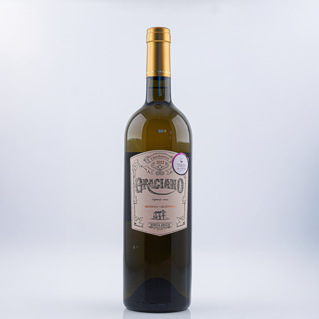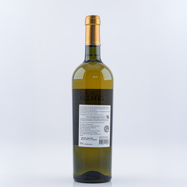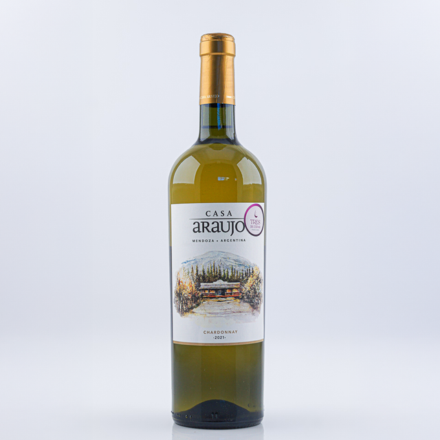 Vino 100% Chardonnay de color amarillo claro con reflejos plateados1234. En nariz, destaca por sus aromas a frutas blancas como manzana, pera y membrillo. Bodega Araujo. San Rafael, Mendoza.